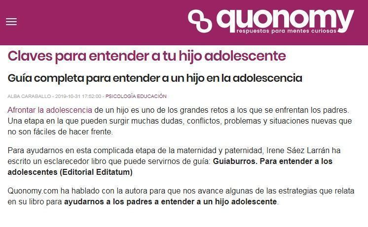 En el portal web Quonomy.com podrás encontrar todas las curiosidades para las mentes más inquietas, respuestas a todas las preguntas que te haces. Por ello, esta revista digital ha querido entrevistar a Irene Saéz por su «GuíaBurros: Para entender a los adolescentes», publicado por la editorial Editatum.