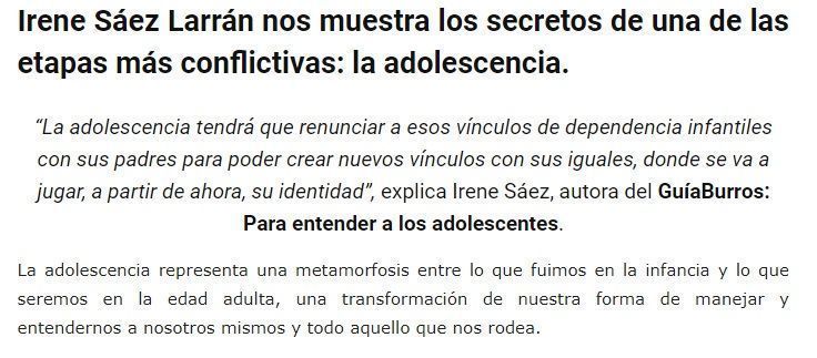 El medio especializado Casa de Letras ha hecho una reseña del «GuíaBurros: Para entender a los adolescentes», de Irene Sáez, un libro que te explica, de manera amena y sencilla, la etapa de la adolescencia y sus claves, desde ¿qué es la adolescencia?, pasando por el significado de sus actos, hasta cómo podemos ayudarles. «La adolescencia es un momento de la vida; es una etapa transitoria y conflictiva donde las personas pasamos de ser niños a ser adultos», explica su autora.